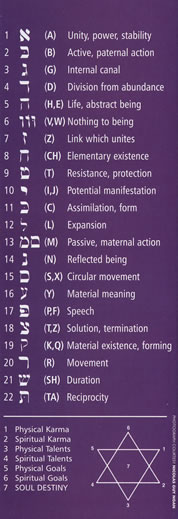 To obtain your reading, the name on your birth certificate is converted to Hebrew phonetically, letter by letter. In Hebrew there is no separation between consonants and vowels, numbers and letters are the same.The sequence of numbers is placed around the Star of David for each letter in turn, starting at the physical karma point, working around the star in a spiral as many times as needed. The numbers at each point are added up to get a total, which is read as two numbers, representing the polarity of life. The ancient energies of these Hebrew letters channel through during a Soul Contract reading.